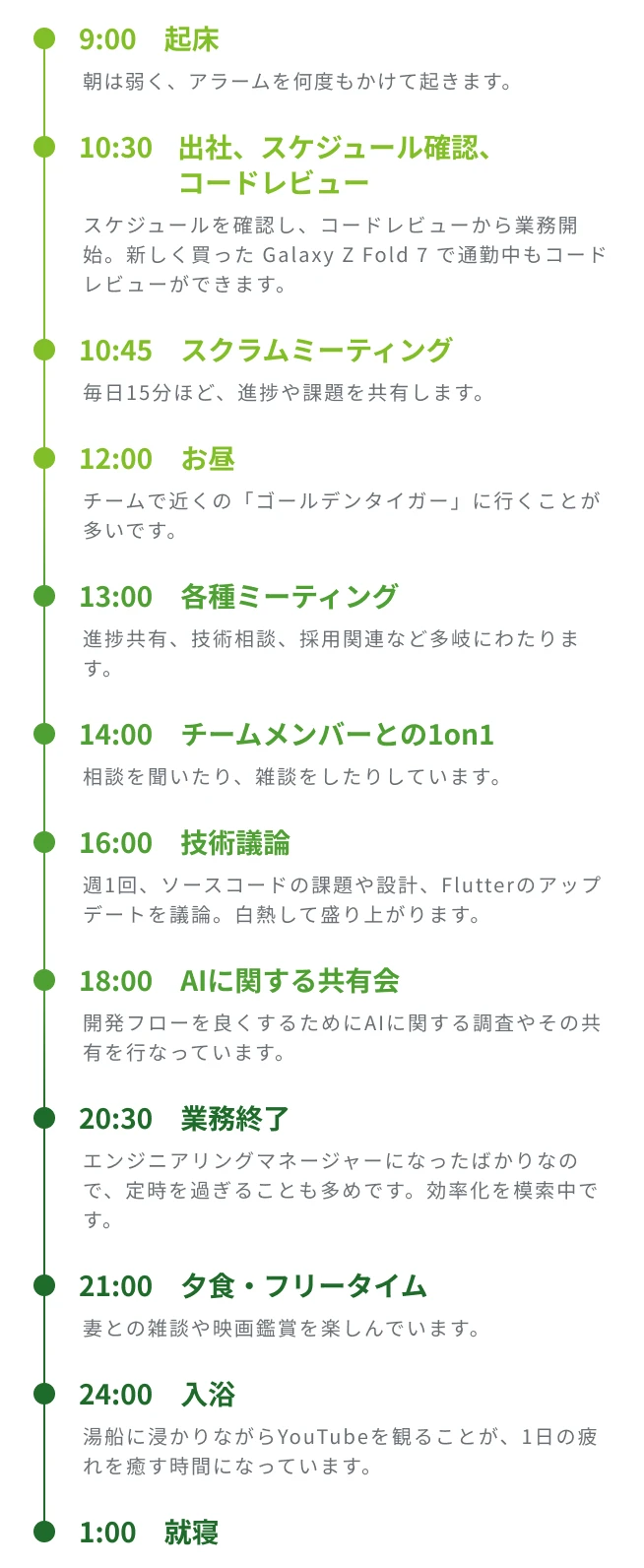 学生時代はSwiftやRubyといった成熟した技術に携わってきましたが、Flutterという発展途上の技術では多くの課題や悩みに直面しました。今ではその経験が大きな成長につながり、自分の血肉になっていると感じています。