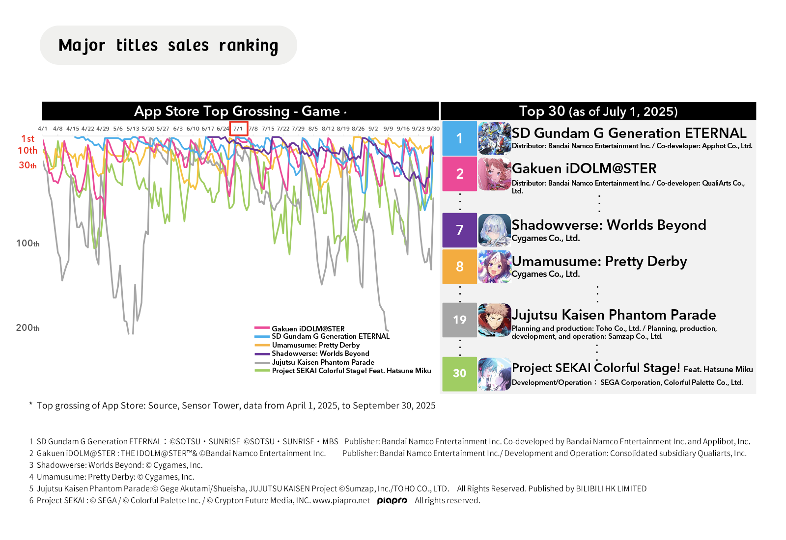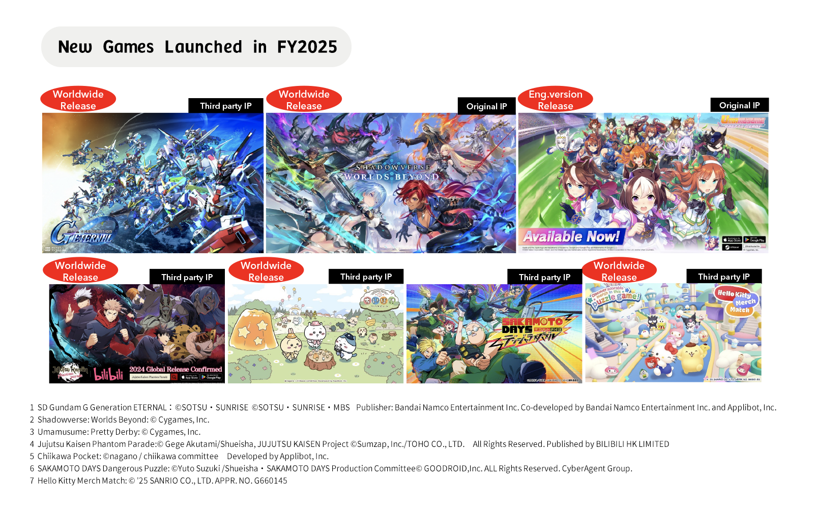 Point1Extending the lifespan of game titles by leveraging operational skills and making them viralOver the years, we have created many hit game titles by cultivating the technology, operational, organizational, and adaptability to change needed to deliver high-quality products. And we have achieved a long lifespan for our major hit games through a wide variety of ways. “Umamusume: Pretty Derby,*” which initially gained fans through its anime, has expanded to new anime series, movies, and comics to attract new users and to deliver new experiences to retained users. It is expanding its presence on multiple platforms, including the launch of English and Steam versions in fiscal year 2025. Currently, multiple flagship games occupy top positions in sales rankings, making our portfolio robust. We are committed to making our games long-lasting and engaging.