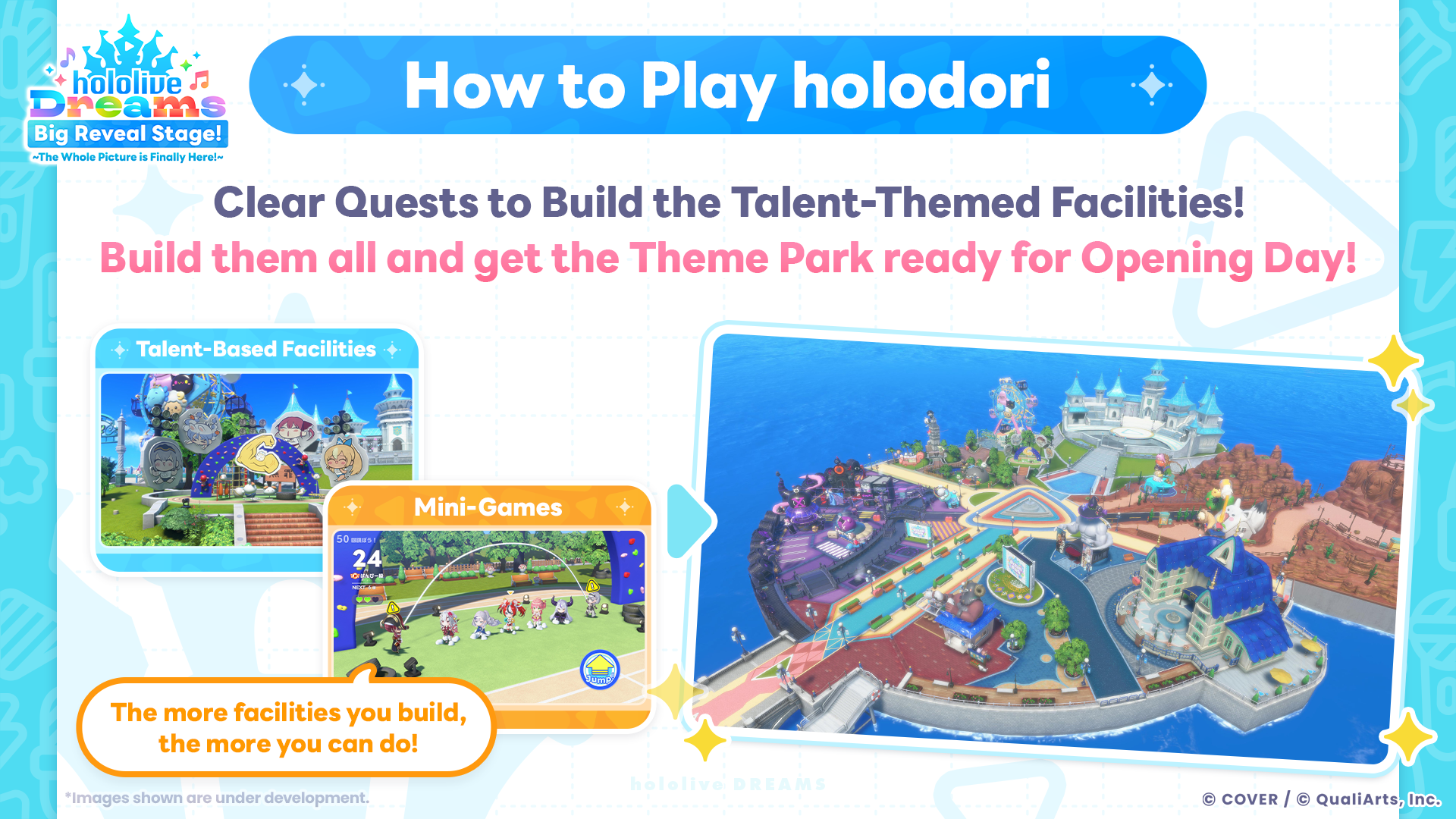 Set on a remote island, the player’s objective is to complete various facilities for the hololive members and build the magical "DREAM PARK" for everyone.