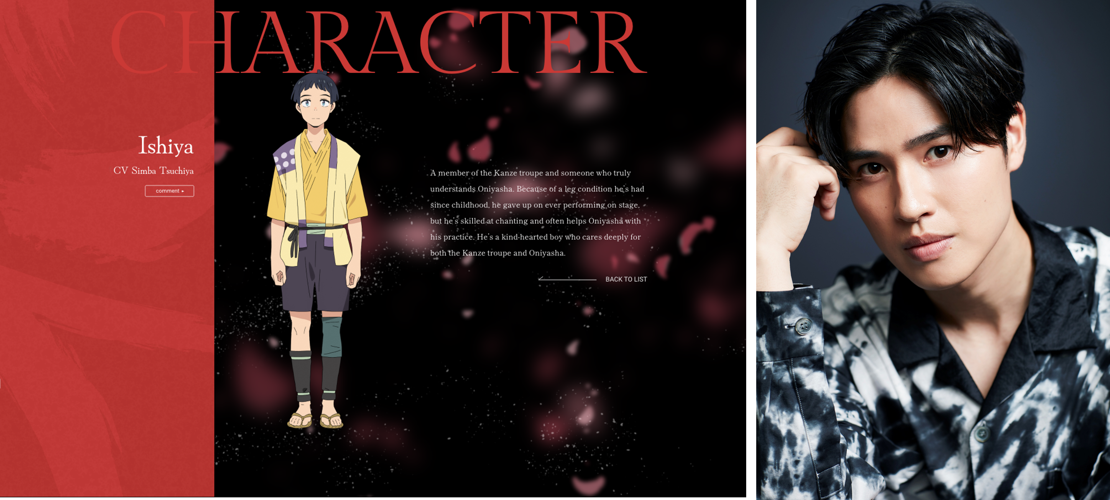 A member of the Kanze troupe and someone who truly understands Oniyasha. Because of a leg condition he’s had since childhood, he gave up on ever performing on stage, but he’s skilled at chanting and often helps Oniyasha with his practice. He’s a kind-hearted boy who cares deeply for both the Kanze troupe and Oniyasha.