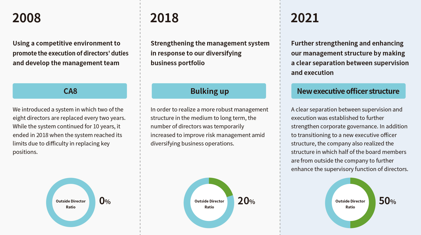 The Board of Directors consists of seven directors who are not members of the Audit Committee (including two outside directors) and three directors who are members of the Audit Committee (including two outside directors).Regularboardmeetings are held once a month and special meetings are held when necessaryto make important decisions and supervise the executions and operations. In addition, the Company established the Corporate Executive Office on October 2, 2020, with the aim of separating management oversight from business execution anddelegated some of the Board's executive authority to the CorporateExecutive Office.The Board of Directors and the Corporate Executive Office have developed an agile management system and are working to strengthen supervisoryfunctions.