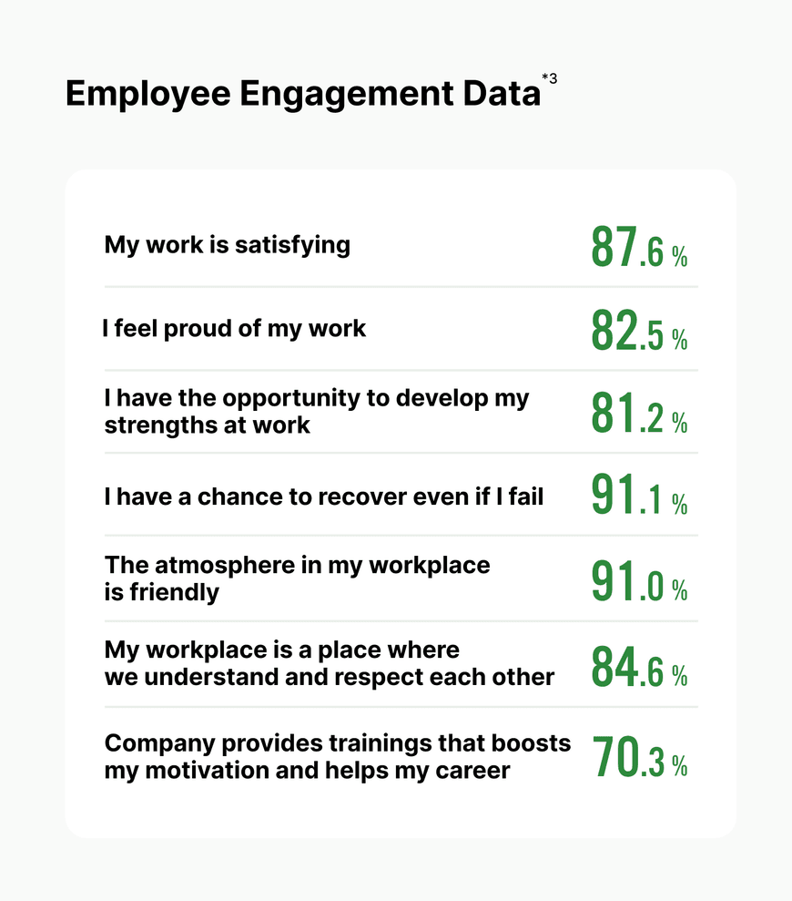 In the FY 2024 stress survey, 87.6%1 of employees said their "work is satisfying." We've held this high score—over 85%—for more than five years. This number blows past the national average; a 2024 PwC survey *2 found only 33% of Japanese employees feel their job is "demanding but fulfilling." We also saw great results in growth opportunities and workplace relationships, which show that our culture of backing our employees' ambitions is paying off.