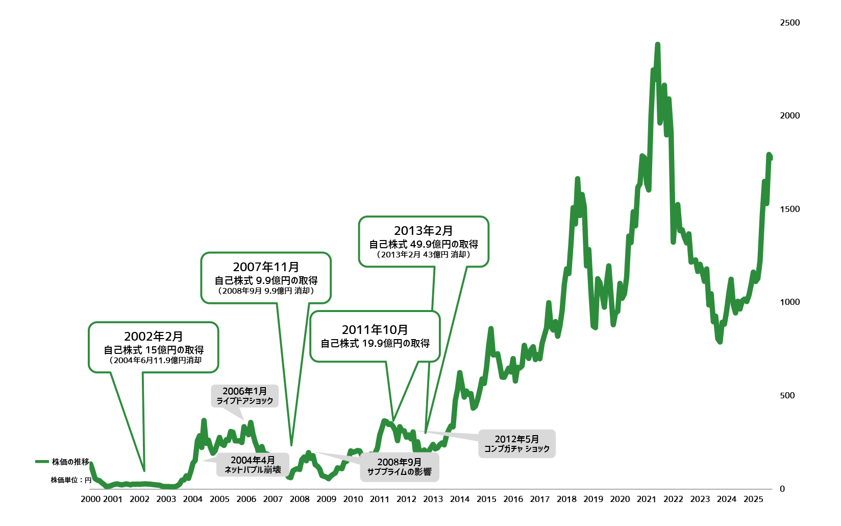 - ※全ての株式分割を考慮し、株価を記載(2013年10月1日から売買単位を100株に変更)