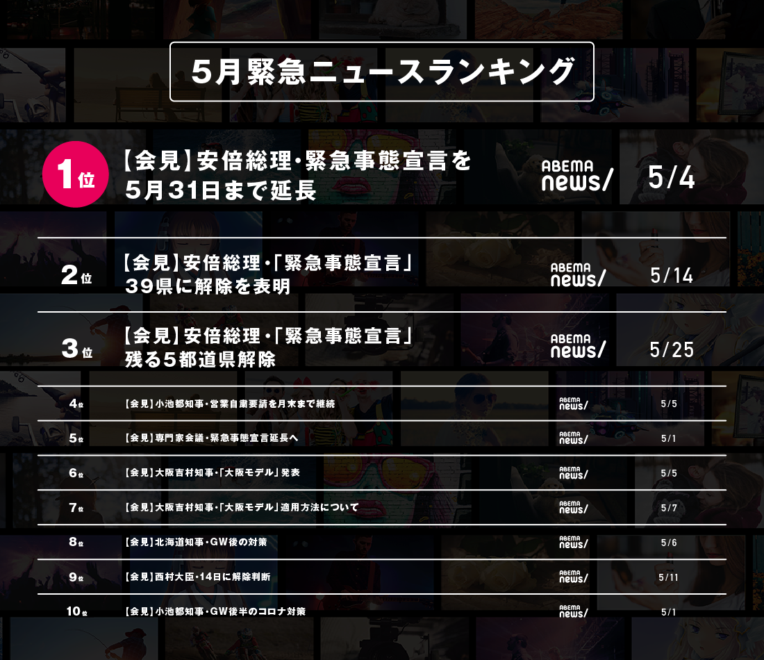 テレビ&ビデオエンターテインメント「ABEMA(アベマ)」(※1)は、2020年5月1日(金)から5月31日(日)までに配信された番組の視聴データをもとにした5月の人気番組ランキングを発表いたします。