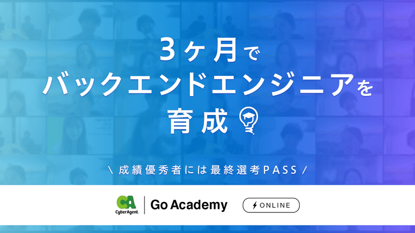 株式会社サイバーエージェント(本社:東京都渋谷区、代表取締役:藤田晋、東証一部上場:証券コード 4751)は、バックエンドエンジニアを育成するための3ヶ月の特別プログラム「Go Academy」の開催をお知らせするとともに、本日より受講者の募集を開始いたします。