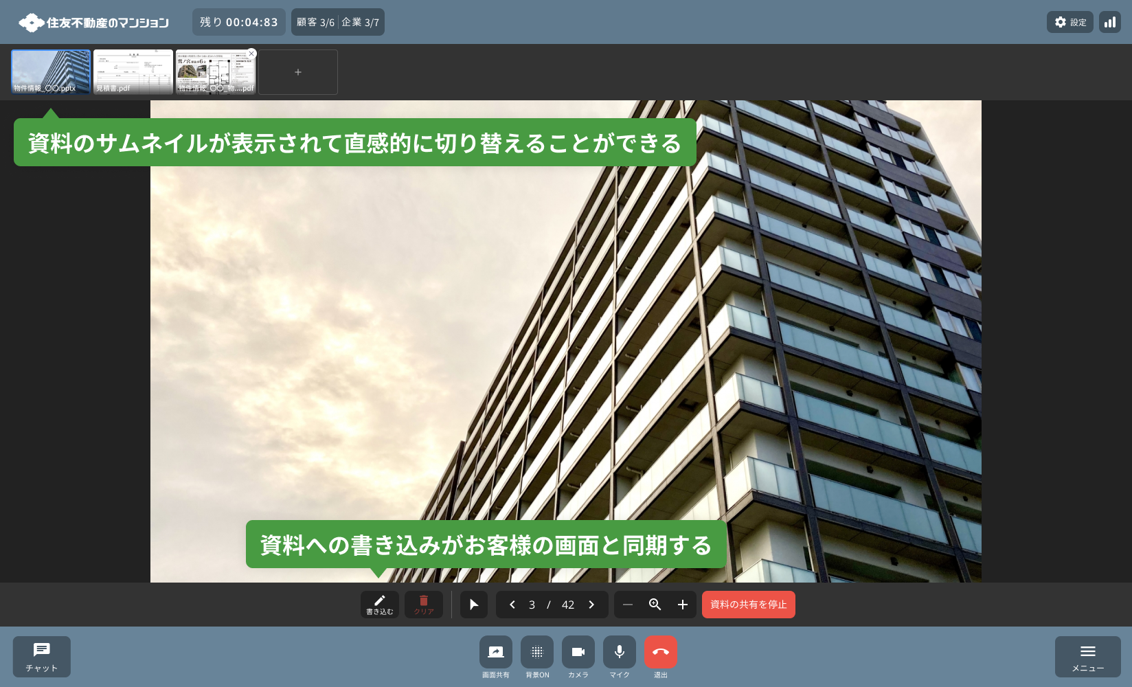 顧客との打ち合わせ時は、紹介動画や3Dシミュレーションなど複数のコンテンツを用いるため、複数回資料の切り替えが発生します。これまではツールの仕様上、画面の切り替えの度に接客が中断されていましたが、「リモてなし」では同一画面上で資料の切り替えが可能となり、接客を中断することなくスムーズに打ち合わせを行うことができます。