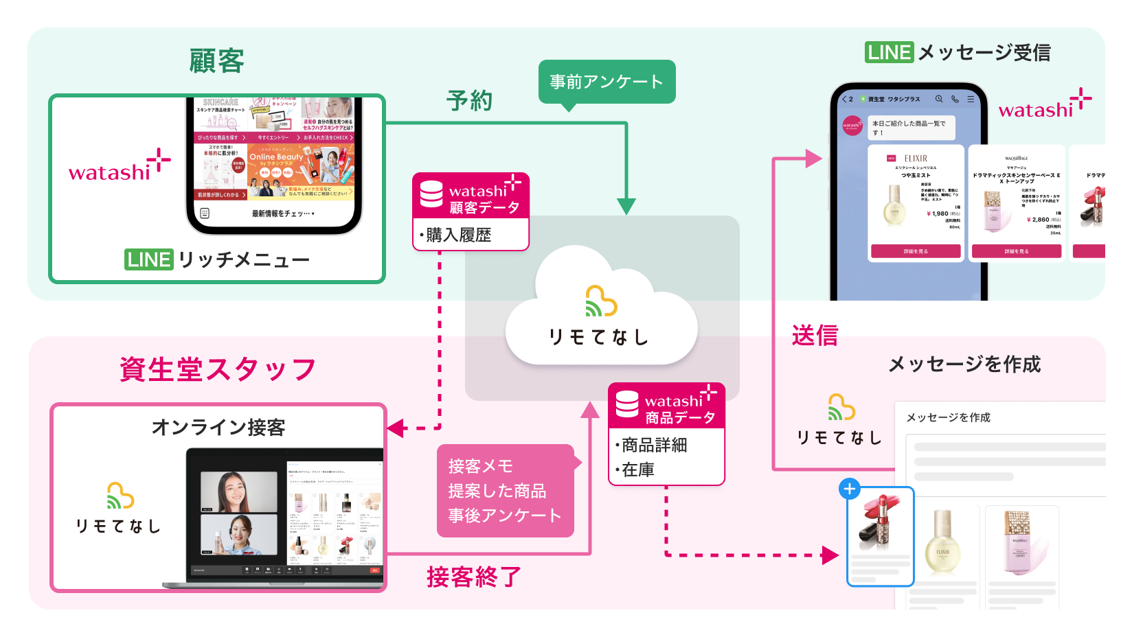 このような背景からWebカウンセリングサービス「Online Beauty by ワタシプラス」に対し、カスタマイズ可能なオンライン接客ツール「リモてなし」の提供を開始いたしました。資生堂が持つ商品データベースや過去の購買データと連携したお客様への最適な商品の提案や、LINE公式アカウントと連携した予約受付・カウンセリング後のアフターフォローを実現いたします。