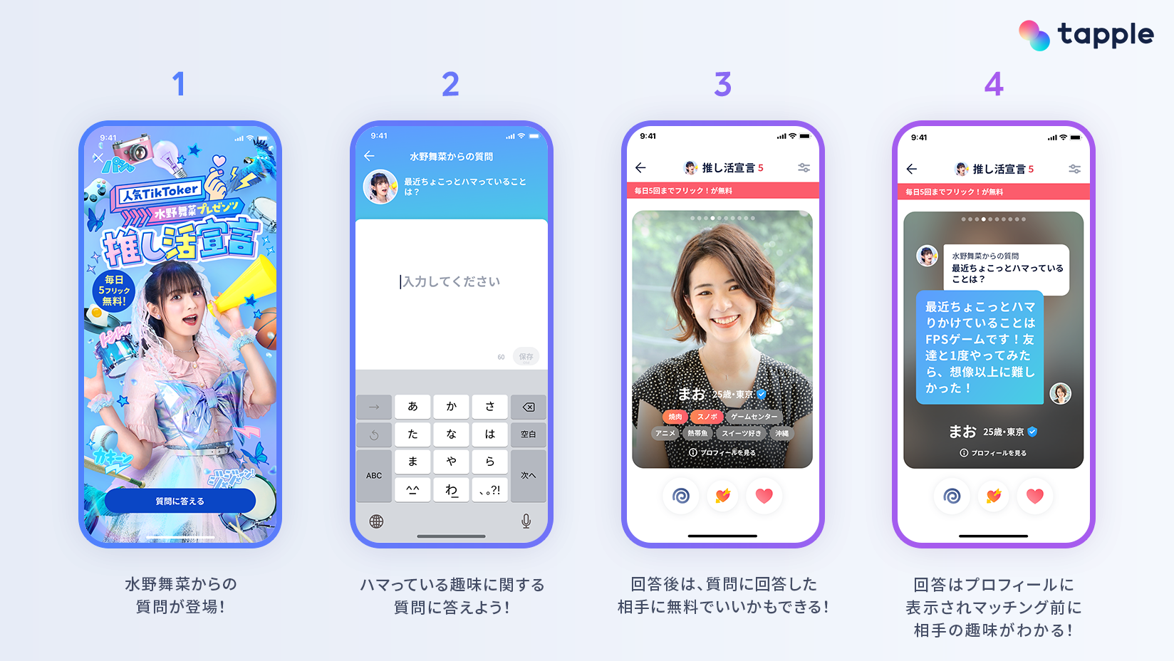 株式会社タップル(本社:東京都渋谷区、代表取締役社長:平松繁和)は、提供するマッチングアプリ「タップル」において、2023年10月18日(水)~12月の期間で、人気TikToker 水野舞菜コラボの新コンテンツ「推し活宣言」を提供することをお知らせいたします。
