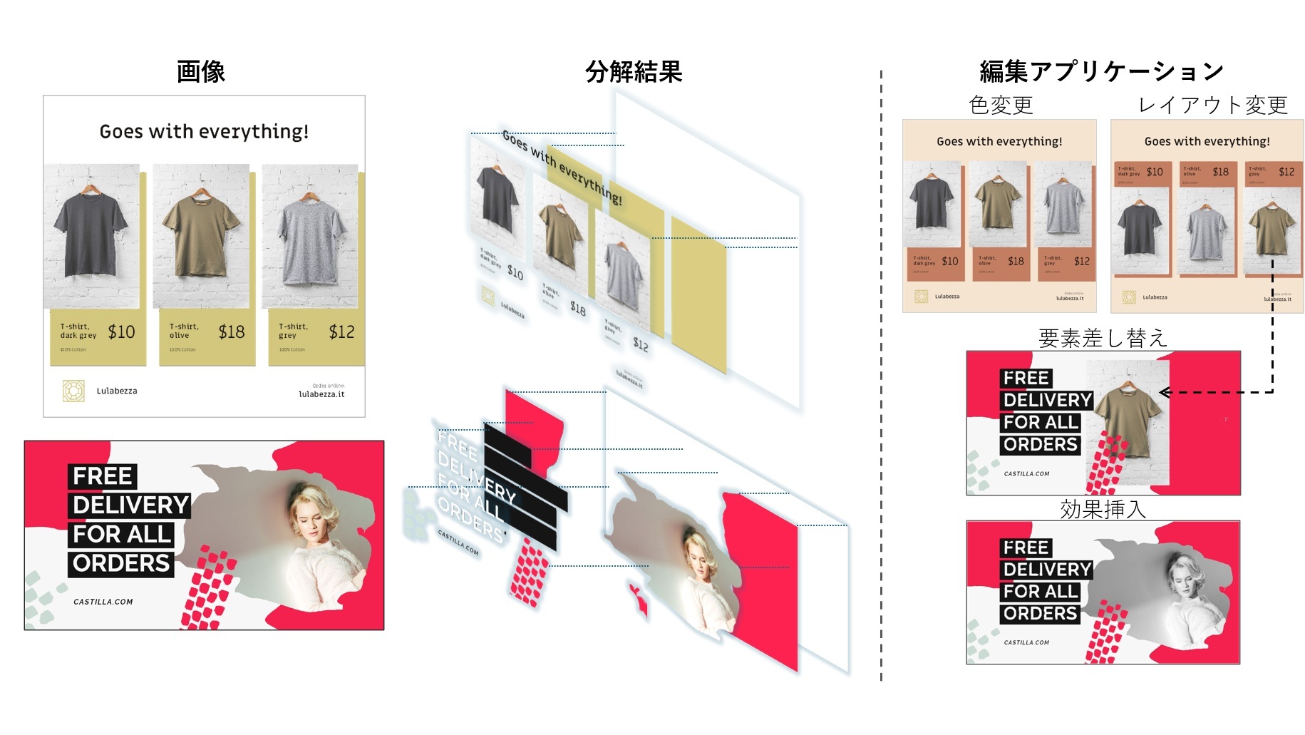 本研究ではグラフィックデザインをレイヤーに分解する技術を提案しました。一度画像化されたデザインはレイヤー構造が失われてしまいますが、提案した技術によりそれらの再編集が可能となります。提案手法ではレイヤー分解を最も手前にあるデザイン要素抽出の繰り返しという単純な問題に捉え直すことで、高品質な分解を実現しました。![]() 本研究の成果は、広告画像制作の効率化やデザインの自動編集技術の実現に役立つことが期待されます。 |