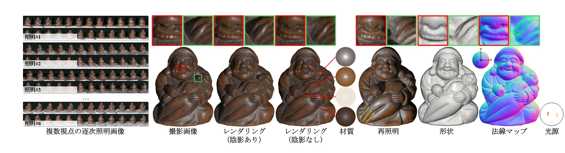 本研究では、スマートフォンのようなカメラとフラッシュライトが固定されているようなデバイスで撮影された複数視点の逐次照明画像から、物体の高精細な形状と材質を復元する手法を提案しました。光源方向と強度を同時に推定することで、既存の方法で必要な煩雑な事前光源校正を不要とし、撮影プロセスの簡略化を実現しています。復元された形状および材質を用いて、写実的な再照明およびレンダリングが可能となります。![]() 本研究の成果は、実写と見間違うような写実的なコンテンツ制作の実現に貢献することが期待されます。 |