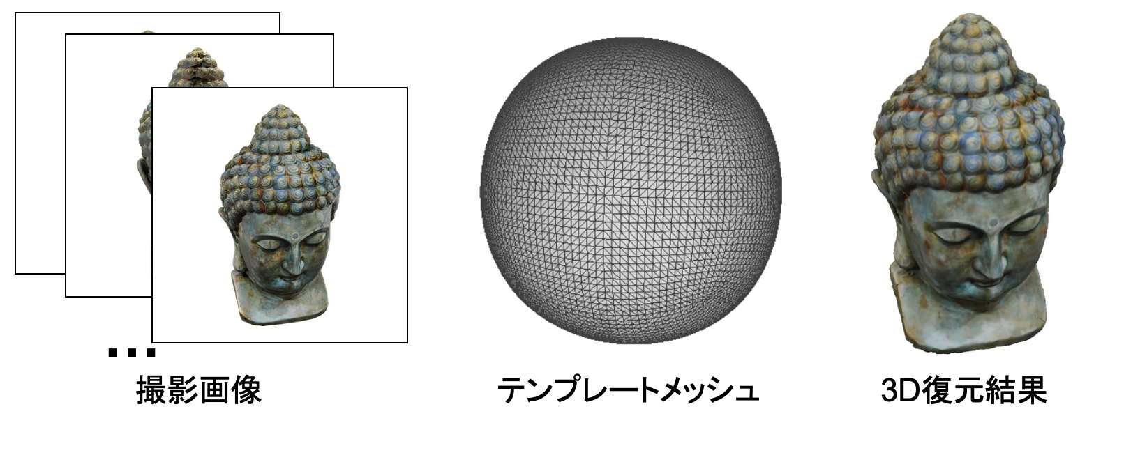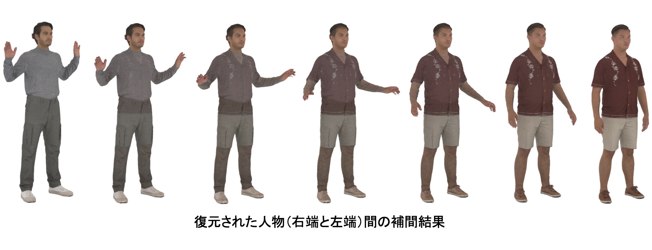 これにより、復元結果は形状を表す3Dメッシュと表面の色などを表すテクスチャの情報で表現され、既存の3Dモデリングツールによる編集が可能となります。また、共通するテンプレートメッシュを用いることで、3D復元結果同士の形状や見た目を容易に補間できます。