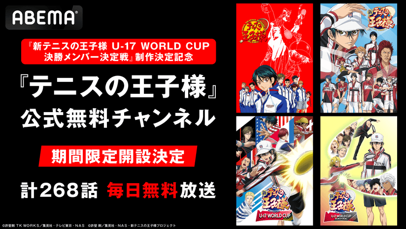 『新テニスの王子様』新シリーズの制作決定を記念し、 『テニスの王子様』公式無料チャンネルが「ABEMA」に初開設 『テニスの王子様』&『新テニスの王子様』シリーズ、OVAまで “計268話”を10月27日(月)から毎日順次無料放送