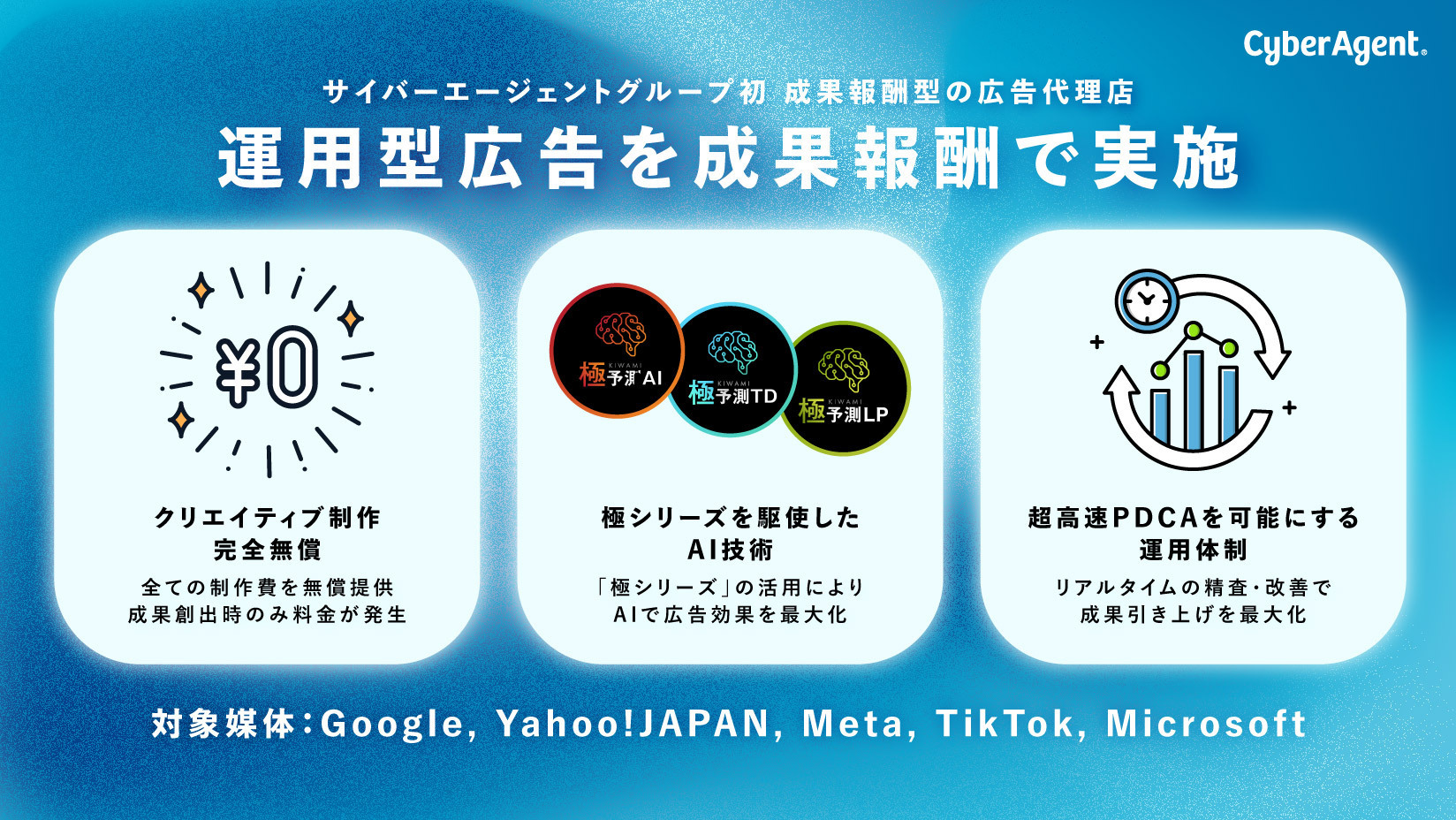 サイバーエージェントはインターネット広告の主流である運用型広告において、国内トップの実績を有しており、特に検索連動型広告において国内主要媒体であるGoogle、Yahoo! JAPAN(LINEヤフー)をはじめ、Microsoft、TikTok、LINE(LINEヤフー)、Meta(Facebook/Instagram)、X、Criteoなど多岐にわたる代理店アワードで売上高No.1および最上位を受賞しています。