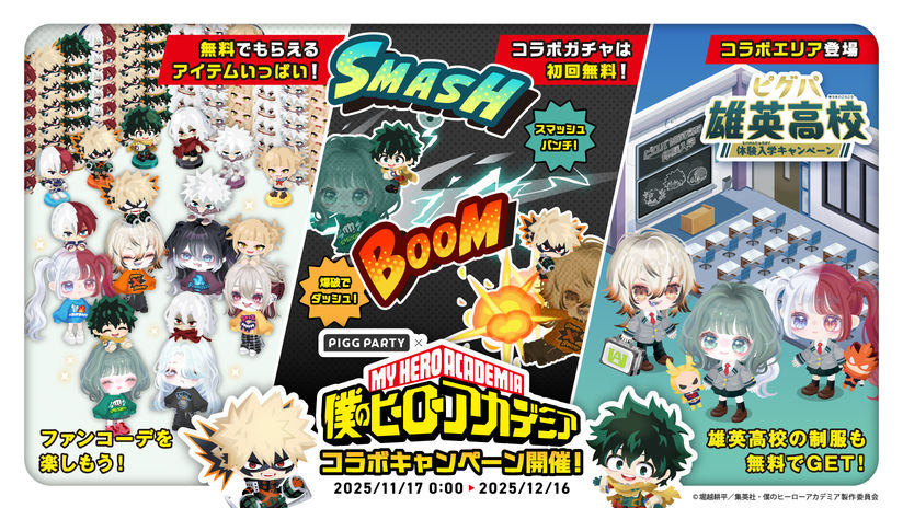 株式会社サイバーエージェント(本社:東京都渋谷区、代表取締役:藤田 晋、東証プライム市場:証券コード4751)が提供するアバターSNSアプリ「ピグパーティ」は、TVアニメ『僕のヒーローアカデミア』とのコラボキャンペーンを2025年11月17日(月)より開始いたします。