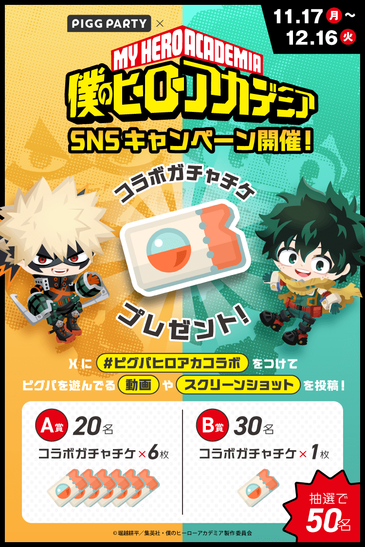 『僕のヒーローアカデミア』コラボを記念し、抽選で50名に「コラボガチャチケット」が当たるSNS投稿キャンペーンを開催。