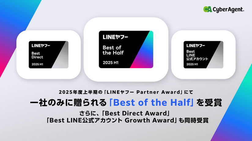株式会社サイバーエージェント(本社:東京都渋谷区、代表取締役:藤田晋、東証プライム市場:証券コード4751)は、LINEヤフー株式会社(本社:東京都千代田区、代表取締役社長:出澤剛)が新設した「LINEヤフー Partner Award 2025」において、「Best of the Half」、「Best Direct Award」および「Best LINE公式アカウント Growth Award」の3部門を受賞いたしました。なお、Best of the Halfは1社のみに贈られる賞となります。