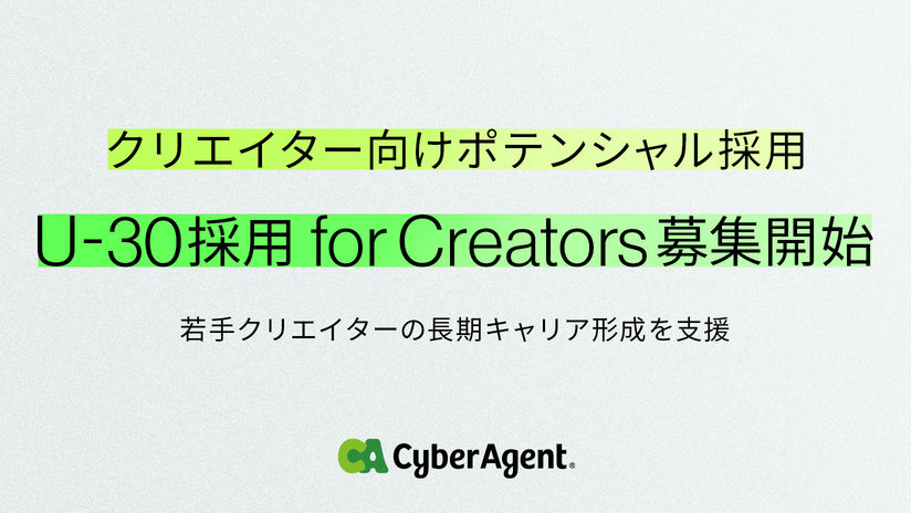 株式会社サイバーエージェント(本社:東京都渋谷区、代表取締役:藤田晋、東証プライム市場:証券コード4751)は、クリエイティブ職のキャリア採用にて長期キャリア形成を目的としたポテンシャル採用「U-30採用 for Creator」の募集を開始いたします。