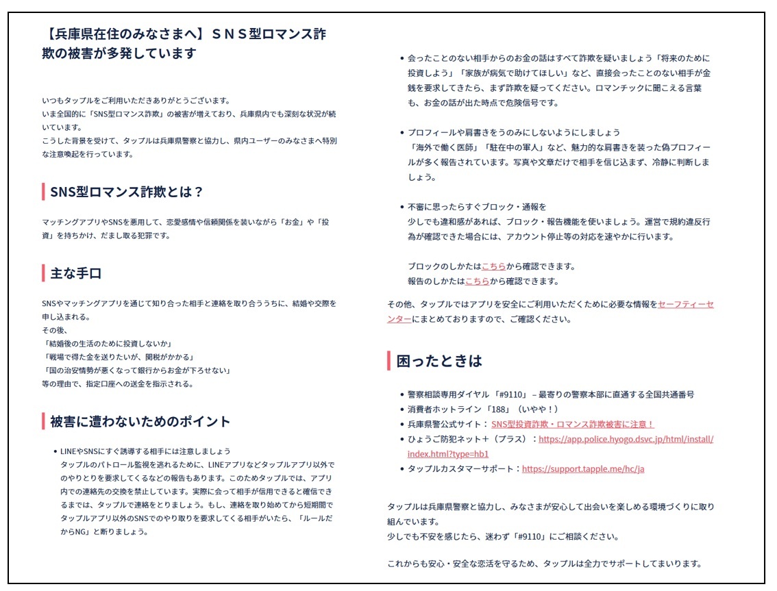 株式会社タップル(本社:東京都渋谷区、代表取締役社長:平松繁和)は、運営するマッチングアプリ「タップル」において、利用者がより安心・安全に出会いを楽しめる環境を提供するため、兵庫県警察と連携した「SNS型ロマンス詐欺」被害防止の啓発活動を2025年11月19日より開始しました。アプリ内のお知らせ記事で県内在住の利用者に向けた注意喚起を強化します。