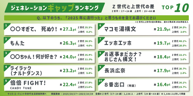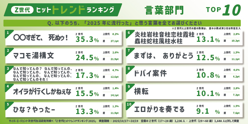 2025年、Z世代の間で流行した言葉は、ランキングの通りです。