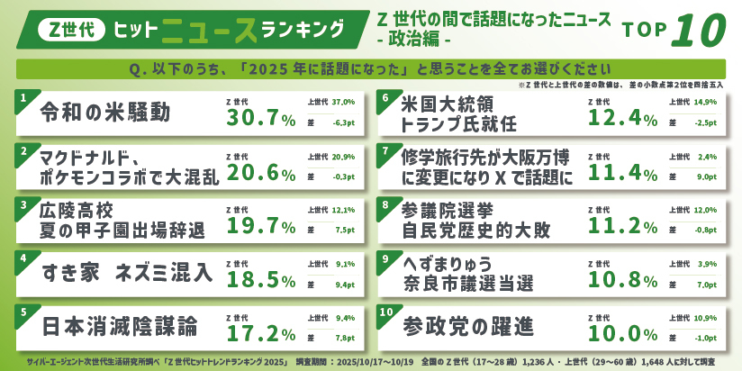 本ランキングでは、1位「令和の米騒動」、8位「参議院選挙 自民党歴史的大敗」(11.2%)など国難・国政に関するニュースとともに、Z世代にとって身近かつ日常生活に接点のあるテーマが多く挙がりました。
