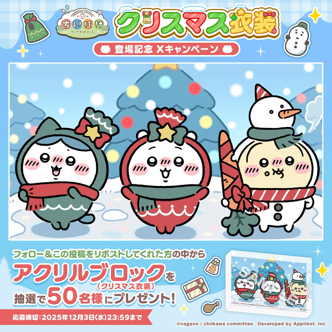 『ちいぽけ』内クリスマスイベント開催にあわせて、『ちいぽけ』公式Xにて「アクリルブロック(クリスマス衣装)」が抽選で当たるキャンペーンを実施いたします。・実施期間: