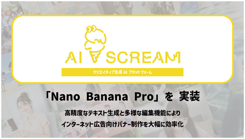 株式会社サイバーエージェント(本社:東京都渋谷区、代表取締役:藤田晋、東証プライム市場:証券コード4751)は、クリエイティブ生成AIプラットフォーム「AI SCREAM(アイスクリーム)」に、Google の最新画像生成AIモデル「Nano Banana Pro(Gemini 3 Pro Image)」を実装したことをお知らせいたします。