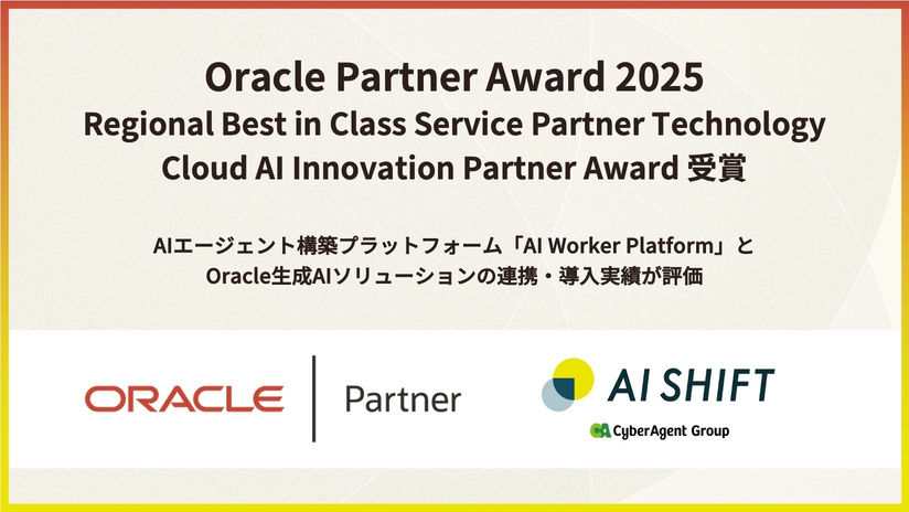株式会社サイバーエージェント(本社:東京都渋谷区、代表取締役社長:山内隆裕、東証プライム市場:証券コード4751)の100%子会社である株式会社AI Shift(本社:東京都渋谷区、代表取締役社長:米山結人、以下AI Shift)は、「2025 Oracle Partner Awards」において、「Regional Best in Class Service Partner Technology/Cloud AI Innovation Partner Award」(※)を受賞しました。この賞は、オラクルのテクノロジーを活用した革新的なサービスを展開し、顧客の業務変革と価値創造に大きく貢献したパートナーに贈られるものです。