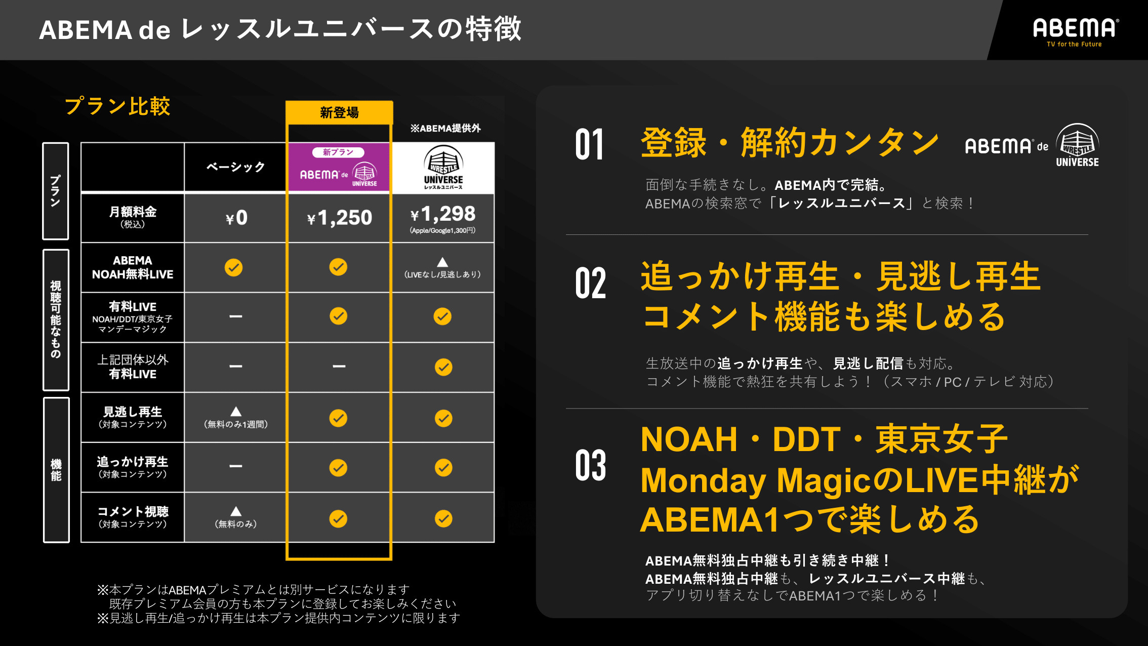 このたび提供を開始する「ABEMA de レッスルユニバース」では、12月23日(火)に行われるプロレスリング・ノアの興行「プロレスリング・ノア THANKSGIVING 2025」以降、これまで「ABEMA」にて生中継していたプロレス興行はもちろんのこと、「WRESTLE UNIVERSE」のみで生中継していたプロレス興行もすべて視聴可能になります。また、「ABEMA de レッスルユニバース」では、興行終了後、いつでも見逃し配信をお楽しみいただけます。