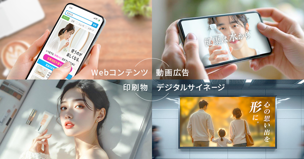 本機能はインターネット広告用の静止画制作に留まらず、制作した画像をキービジュアルとして活用することで、動画コンテンツの素材制作にも応用可能です。 その他、イベント告知バナーやメールマガジンのサムネイル画像、印刷物やデジタルサイネージなど、幅広い用途での活用が期待されます。