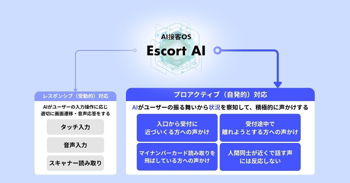 今回の「Escort AI」搭載により、「薬局受付AIエージェント」の薬局AI受付は患者さんの状況をリアルタイムに判断し、必要なタイミングで必要な接客を行う“環境適応型”のAI受付へ進化しました。