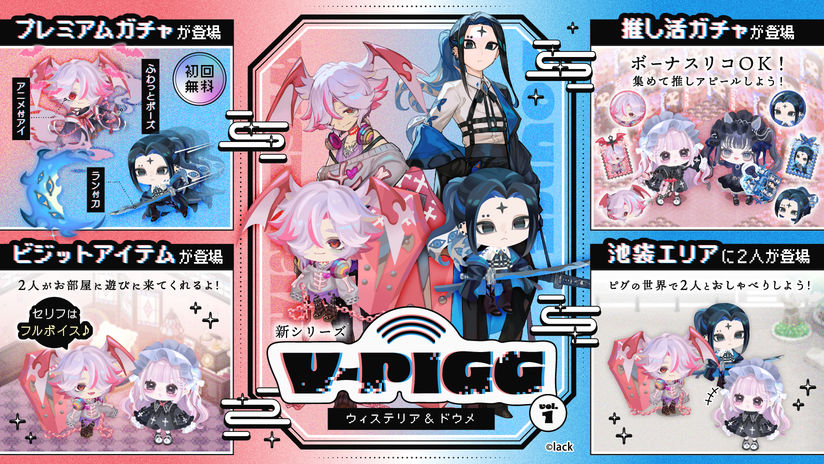 「V-PIGG」は、豪華クリエイター陣による独自のビジュアルとキャラクターボイスを軸に、バーチャルな世界で個性豊かなキャラクターと共に過ごす体験を提供するピグパーティ発のオリジナルキャラクターシリーズです。