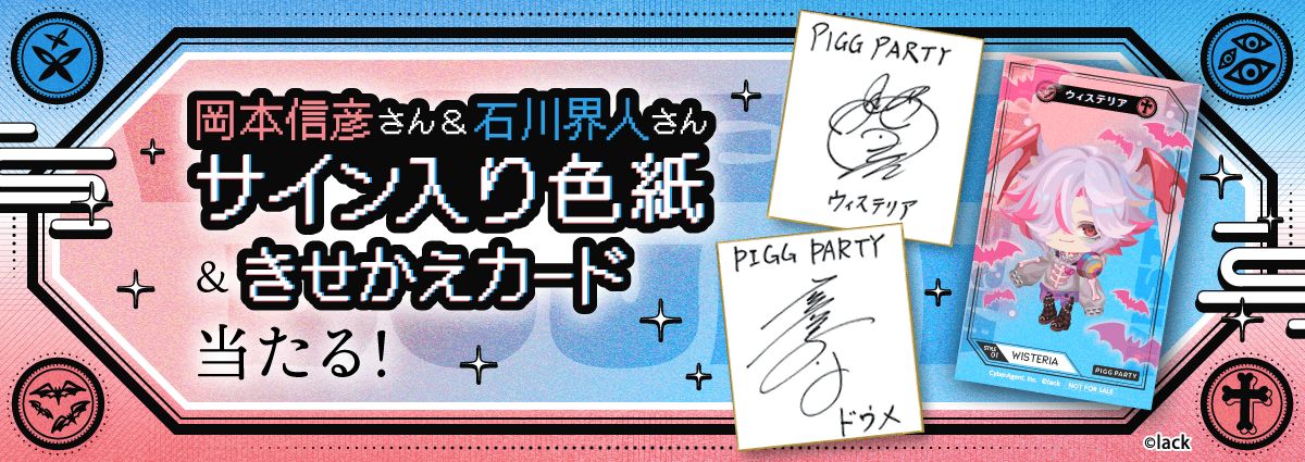 さらに、ピグパーティ公式X(@PiggPARTY)をフォローのうえ、対象ポストを指定のハッシュタグ付きで引用リポストした方の中から抽選で、声優陣の直筆サイン色紙や限定グッズをプレゼントいたします。ぜひ、ボイスの感想や、きせかえを楽しんだ2人のコーディネートを投稿してお楽しみください。