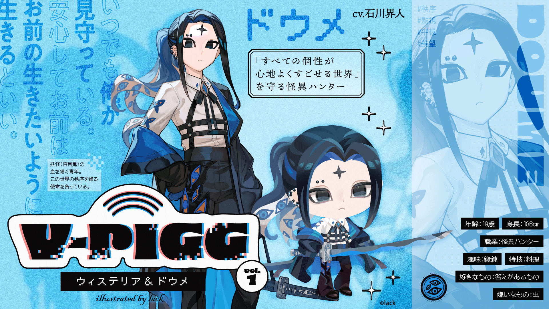 妖怪「百目鬼」の血を継いでいる。生まれた時からこの世界の秩序を守る使命を持っている。