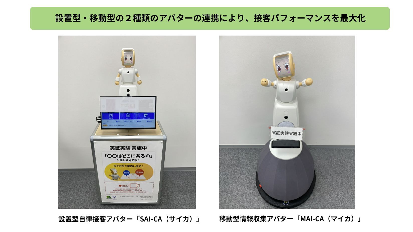 本実証では、設置型自律接客アバター「SAI-CA(サイカ)」と移動型情報収集アバター「MAI-CA(マイカ)」の2種類を活用します。移動型情報収集アバターが現地を巡回して収集した最新の施設情報や状況変化を、遠隔地にいるオペレーターが即座に把握・整理。オペレーターが現地に赴くことなく、詳細な最新情報を設置型自律接客アバターの案内に反映する運用の実現を目指します。