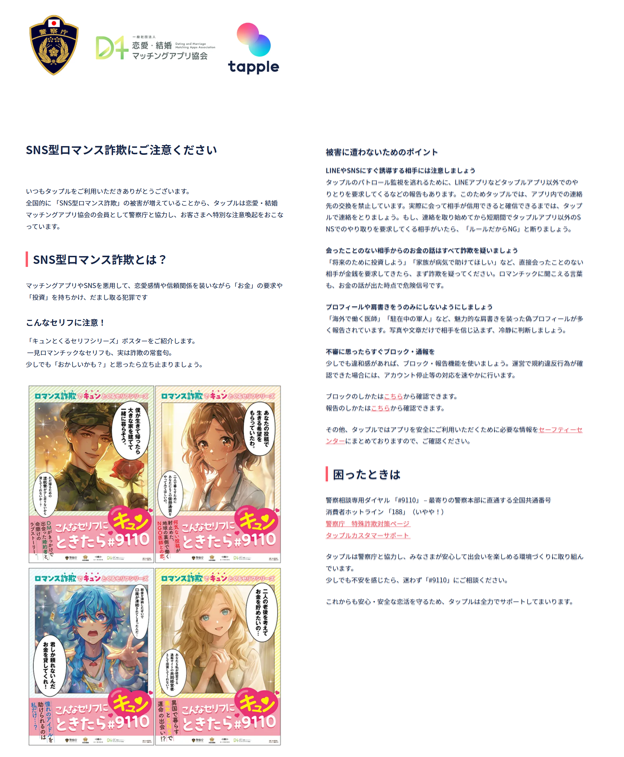 株式会社タップル(本社:東京都渋谷区、代表取締役社長:平松繁和)は、加盟する一般社団法人恋愛・結婚マッチングアプリ協会が警察庁からSNS型ロマンス詐欺への注意喚起について協力依頼を受けたことに呼応し、協会の正会員企業として警察庁と連携し、SNS型ロマンス詐欺被害防止の啓発をユーザー向けに実施いたしました。