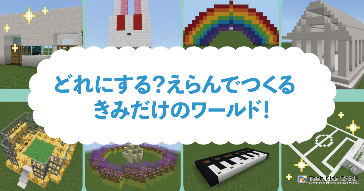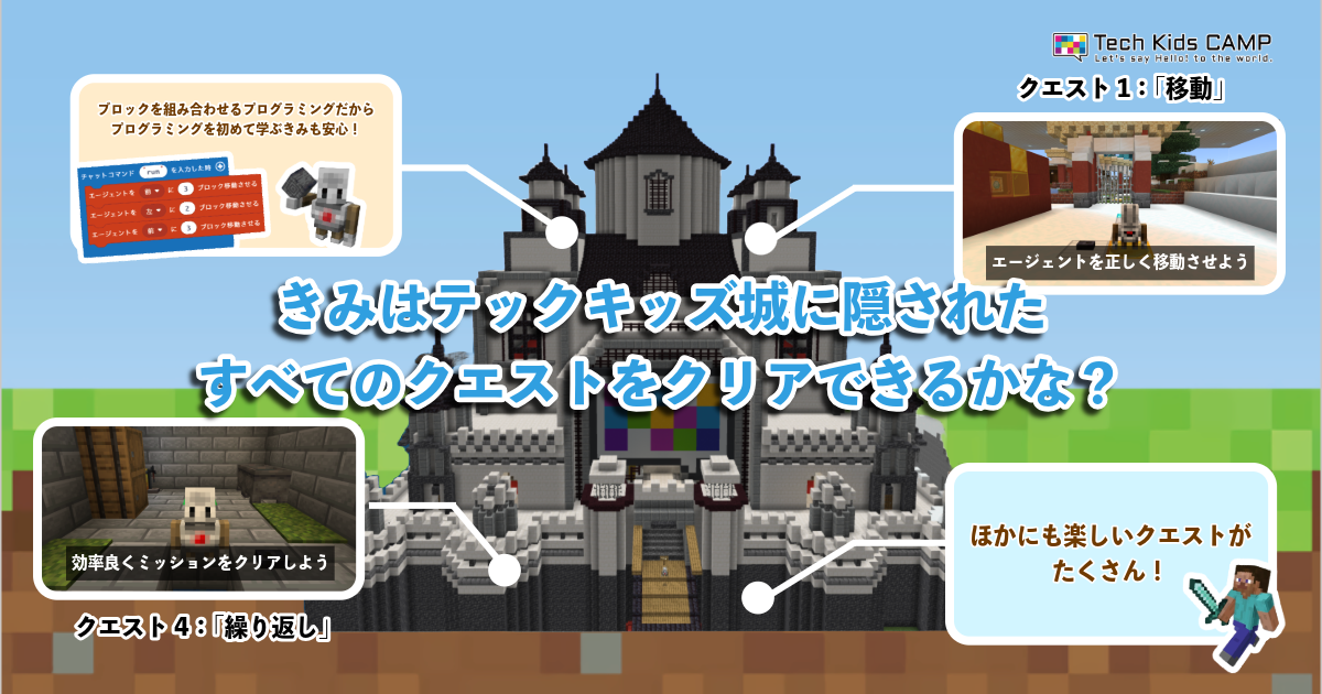 マインクラフトコースでは、Tech Kids CAMP独自の教材を用いて、クエスト形式でプログラミングの考え方を学びます。オリジナル作品の制作では、約150種類の教材を用意しており、街づくりや仕掛けづくり、冒険要素を取り入れるなど、何度参加しても異なる作品づくりを楽しむことができます。