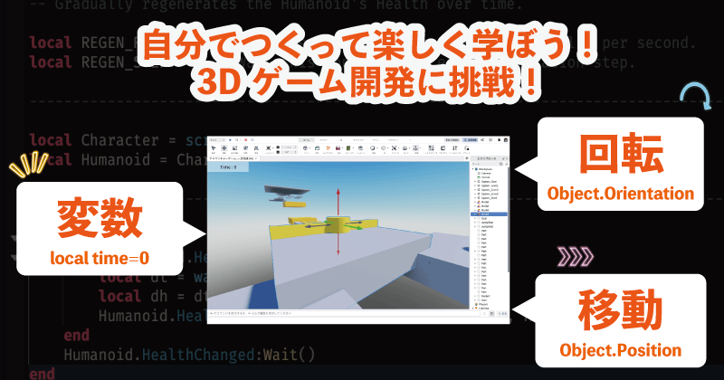 ロブロックスコースでは、「Roblox Studio」とTech Kids CAMP独自の教材を使用し、動きのある仕掛けを取り入れた3Dゲーム制作に挑戦します。