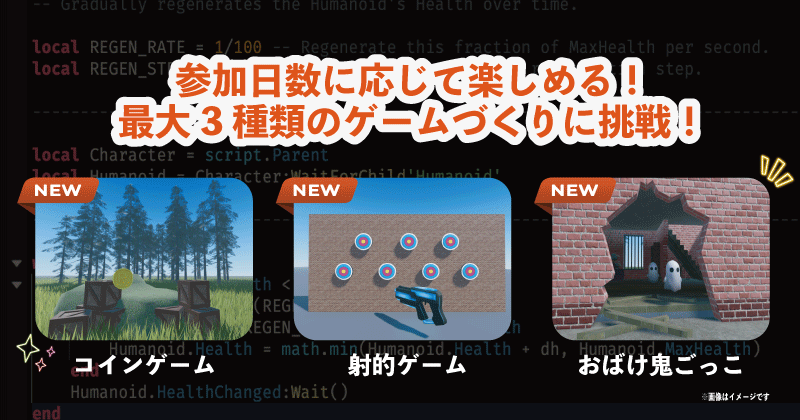 今夏開催する「Tech Kids CAMP Summer 2026」では、2025年に新設し大人気を博しているロブロックスコースにて、「コインゲーム」「射的ゲーム」「おばけ鬼ごっこ」などの新しい教材をご用意いたしました。Tech Kids CAMPに初めてご参加されるお子様はもちろん、これまでにご参加いただいたお子様にも、新しい発見を楽しんでいただける内容となっております。