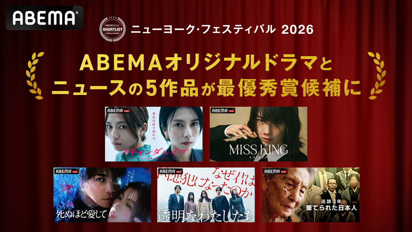 ABEMAオリジナルドラマ『スキャンダルイブ』『MISS KING / ミス・キング』『死ぬほど愛して』 『透明なわたしたち』、オリジナルドキュメンタリー『追跡3年 棄てられた日本人』の5作品が 世界最大規模の国際メディアコンクール『ニューヨーク・フェスティバル 2026』の最優秀賞候補に