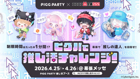 株式会社サイバーエージェント(本社:東京都渋谷区、代表取締役社長:山内隆裕、東証プライム市場:証券コード4751)が運営する、累計ダウンロード数2,300万人のアバターSNS「ピグパーティ」は、2026年4月25日(土)・26日(日)に幕張メッセで開...