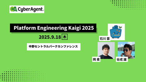 9月18日(木)に中野セントラルパークカンファレンスにて開催される「Platform Engineering Kaigi 2025」に石川雲、岡麦、谷成雄が登壇いたします。 なお、サイバーエージェントは当カンファレンスにプラチナスポンサーとして協賛しています...