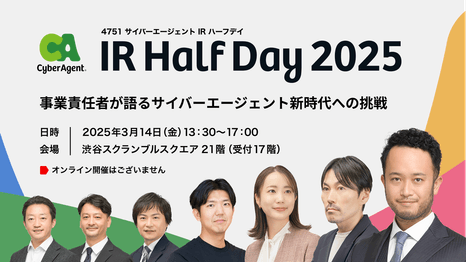 株式会社サイバーエージェント(東証プライム市場:証券コード4751、本社:東京都渋谷区、代表取締役 代表執行役員社長:藤田晋)は、2025年3月14日(金)にIRハーフデイの開催を予定しています。 ■テーマ:「 事業責任者が語る サイバーエージェント新時代へ...