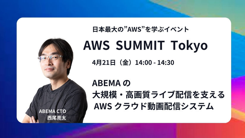 2023年4月20日(木)~21日(金)にかけて開催する、日本最大の "AWS を学ぶイベント"「 AWS Summit Tokyo」にABEMAのCTOを務める西尾亮太が登壇します。