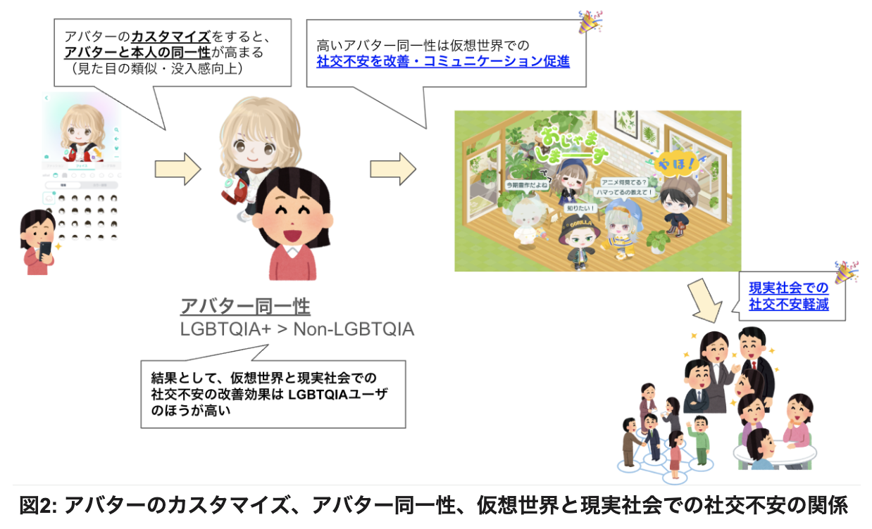 仮想世界での社交不安をより減らしてコミュニケーションを促進し、それによって現実社会での社交不安を改善することについて検討しました。調査の結果、アバターをカスタマイズすることによってユーザはアバターと自分との同一性を強く感じる(自分と似ていると思う・没入感を感じる)ようになり、それが仮想世界での社交不安を改善・コミュニケーションを促進しうることがわかりました。そして仮想世界でのコミュニケーションは現実社会での社交不安症状を軽減することが示唆されました。またアバター同一性はLGBTQIA+ユーザのほうがそうでないユーザよりも高い傾向に有り、結果として社交不安改善効果はLGBTQIA+ユーザのほうが高いことが示されました。