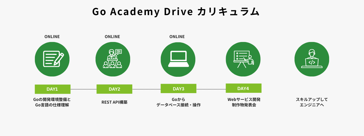 今回開催する「Go Academy Drive」では、「Go Academy」で培ってきたノウハウを元に短期間でバックエンドとしての土台を構築していただくカリキュラムをご用意しております。現在IT・Web業界でエンジニアとして携わっている方、エンジニアとしてWeb以外の開発をしているがWeb開発に興味のある方を対象に、外部より講師を招いた全4回のプログラムでGoの言語仕様からパブリッククラウド、データベースを用いたWebサービス開発まで一連の流れを習得することを目標としています。