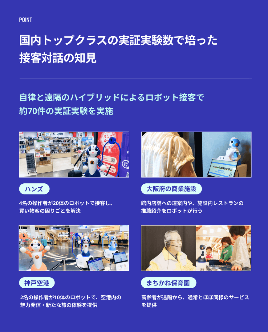 一方で、複雑な質問や状況には、AIの対応から遠隔の有人対応にスムーズに切り替え可能なインターフェースも開発しており、過去の実証実験では、スタッフ1名が遠隔で5拠点のロボットを同時に管理・操作し、案内成功率90%以上を達成しました。