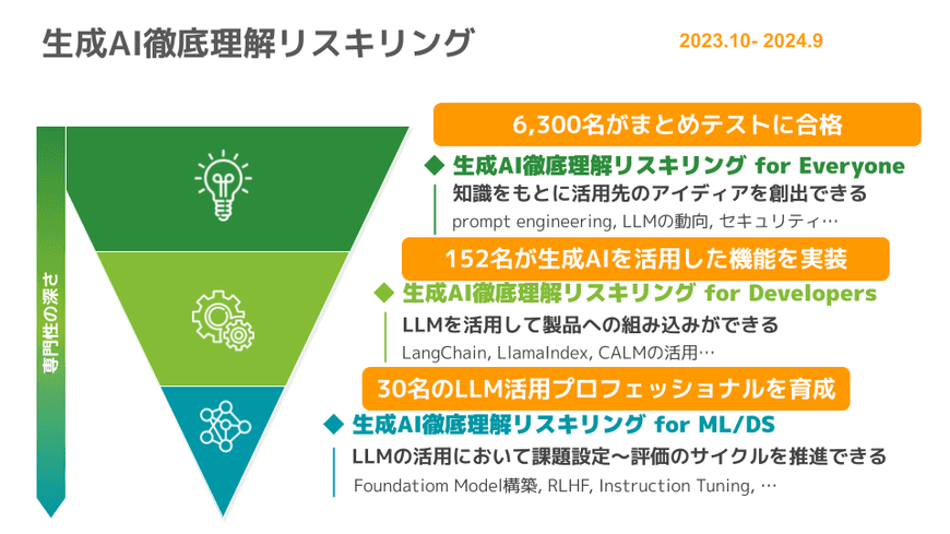 全社的なAI人材育成をより強化することを目的に、2023年10月より社内向けに開始した「生成AI徹底理解リスキリング」。対象を全社員・エンジニア・機械学習エンジニアの3つの階層に分け、約1年様々な育成施策に取り組んできました。