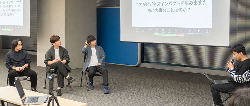 第1部では、半熟仮想(株) 共同創業者であり、Forbes JAPAN「30 UNDER 30」に選出された齋藤優太氏をお招きし、「ML/DSにおける問題設定術」について講演いただきました。 続く第2部では、齋藤氏に加え、当社執行役員兼主席エンジニアの木村、AI Lab リサーチサイエンティストの暮石が登壇。「現場視点×経営視点」でパネルディスカッションを実施しました。
