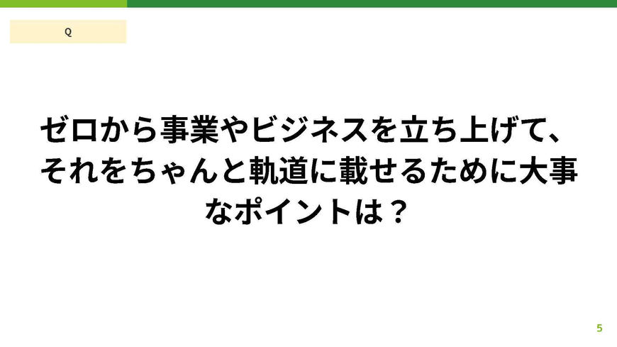 司会:では、次の質問に移りたいと思います。「ゼロからビジネスや事業を立ち上げ、軌道に乗せるために大事なポイントは何か?」という質問です。