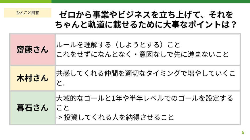 暮石:私は「短期的なゴール、当初1年や半年レベルでのゴールを設定し、投資してくれる人を納得させること」と回答しました。